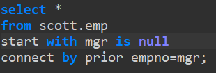 select * from scott.emp // emp테이블에서 start with mgr is null // mgr이 null일때 시작한다. connect by prior empno=mgr; // for문과 비슷하지.empno와 mgr이 같은지 계속 비교하나씩 뜯어본다면