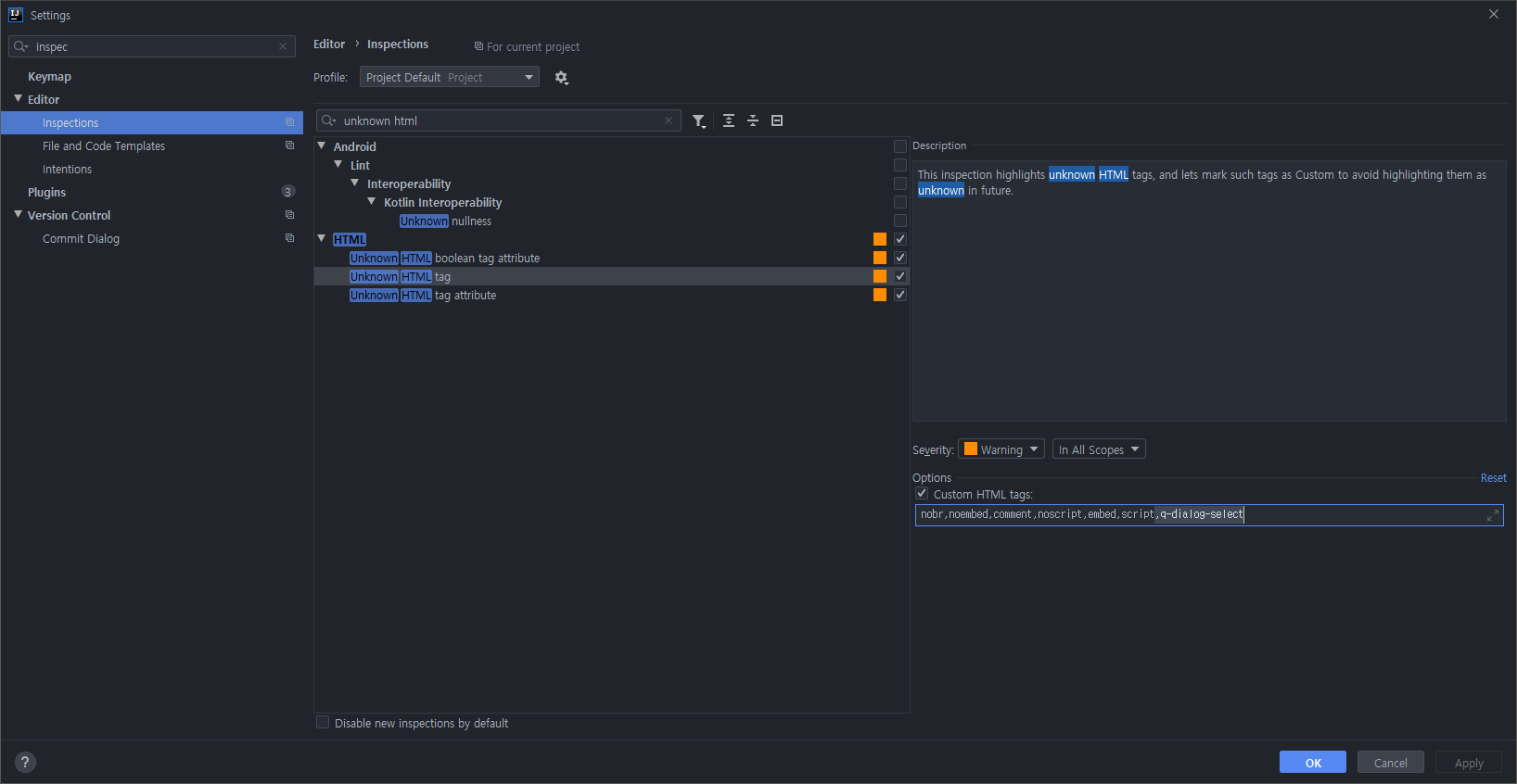 settings - editor - inspections - unknown html - 오늘쪽에서 해당 custom tag삭제 후 저장