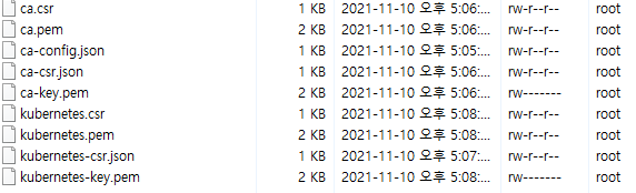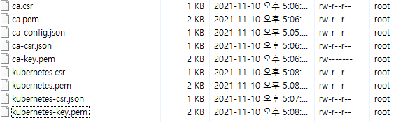 아래 사진의 ca.pem, kubernetes.pem, kubernetes-key.pem 세개 파일을 옮겨야했는데 마지막 파일만 이동이 안되어 자세히 보니 권한이 rw------- 였습니다.
