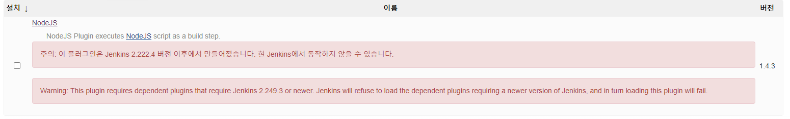 그때, NodeJS 플러그인은 Jenkins 2.222.4버전 이후에 만들어졌는데 제 Jenkins는 2.222.3이었습니다.