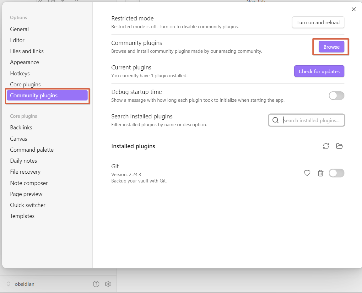 Obsidian-Git을 설치하는 블로그가 많았는데, obsidian v1.6.5에선 플러그인 이름이 Git으로 바뀐것같다.
